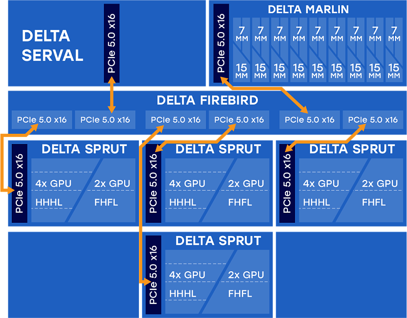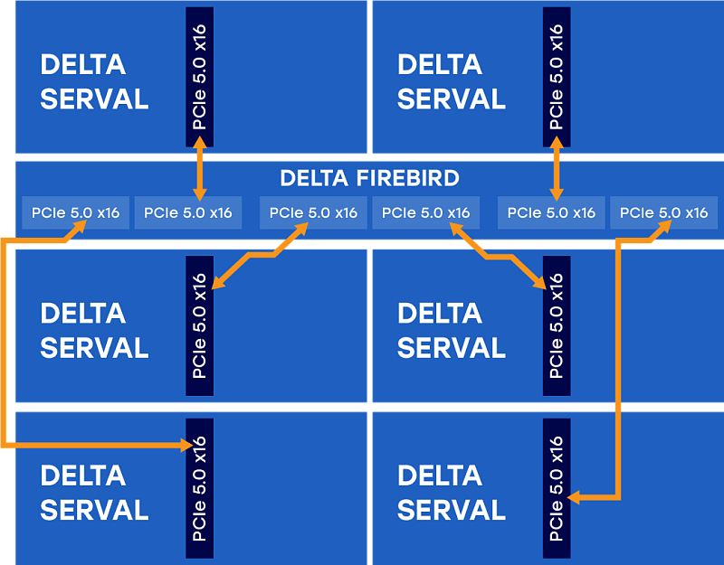 Delta Firebird представляет собой PCI Express коммутатор, который обеспечивает подключение до 6 устройств по интерфейсу PCIe Gen5.