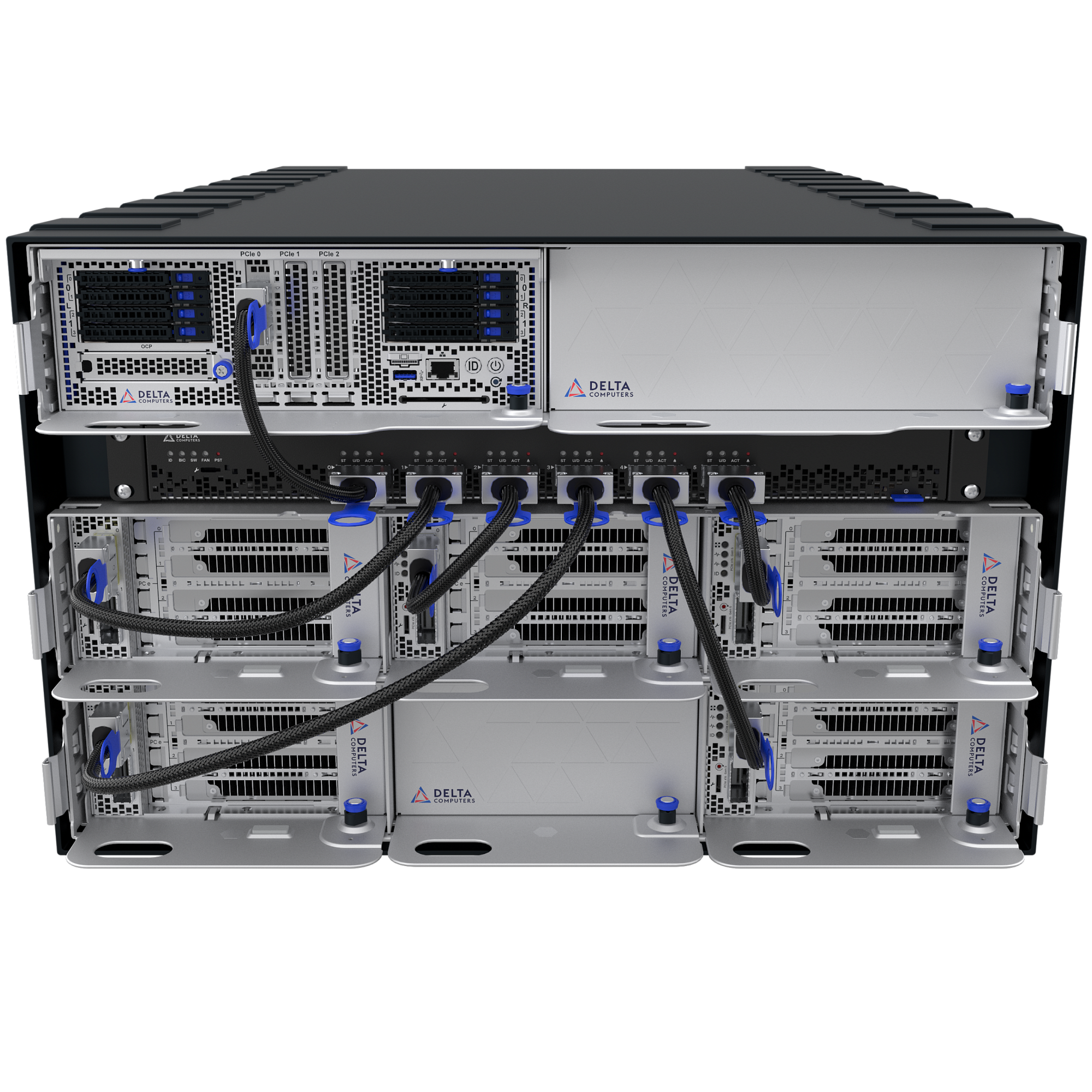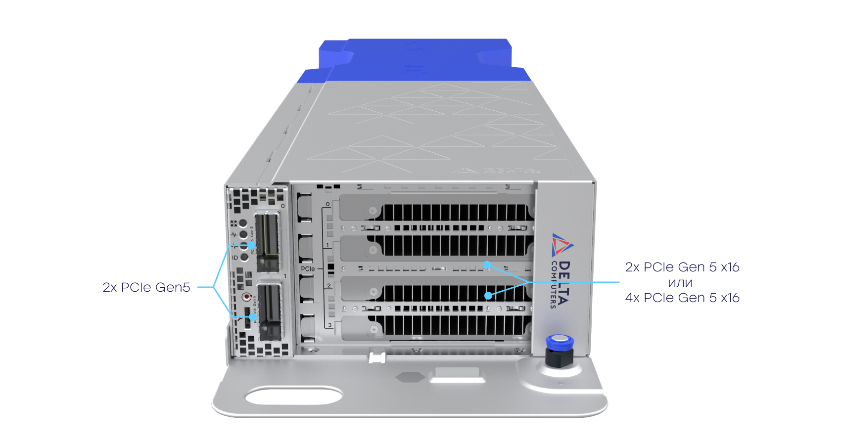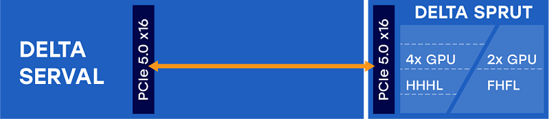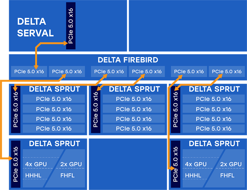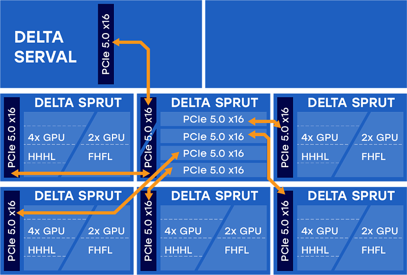 Модульная архитектура позволяет масштабировать количество акселераторов до 10-ми FHFL-полноразмерных, например, NVIDIA H100, или до 20-ти HHHL-адаптеров.